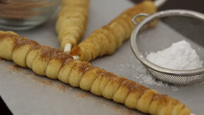 Step2In small bowl, stir together sugar and cinnamon. Sprinkle mixture evenly over dough.