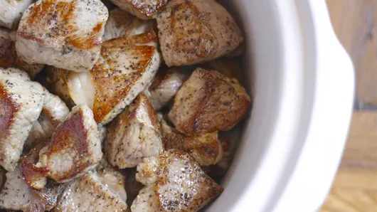 Step2Season 4 lb pork butt or shoulder, cut into 2-inch chunks, with salt and pepper all over. In batches, sear pork in oil until browned, about 1 minute on each side. After searing all of the pork, deglaze skillet with 1 1/2 cups apple cider, scraping up any brown bits from bottom of skillet.