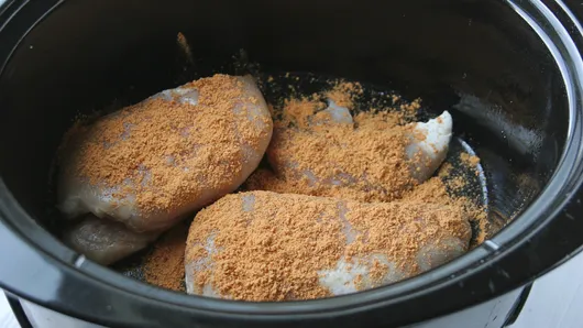 Step1Spray 3- to 4-quart slow cooker with cooking spray. Place chicken in slow cooker. Sprinkle taco seasoning over chicken; pour salsa over chicken.