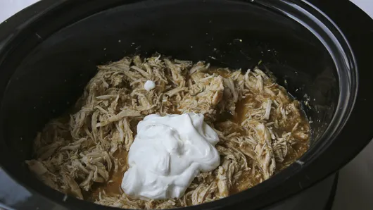 Step3Using 2 forks, shred chicken in slow cooker. Stir in sour cream. Serve chicken over rice. Garnish with additional cilantro, if desired.