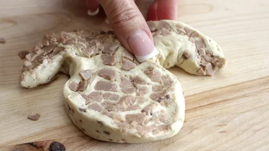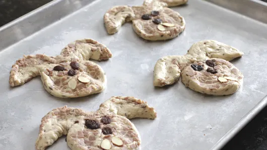 Step3On each bunny head, place 2 raisins for eyes, 1 raisin for nose and 2 almonds for teeth, pressing firmly into dough so they remain in place while baking.