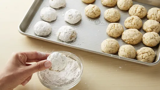 Step4Meanwhile, in small bowl, mix powdered sugar and cinnamon until well blended. Roll warm cookies in powdered sugar mixture. Roll in powdered sugar mixture again. Cool completely, about 30 minutes. Store covered at room temperature.