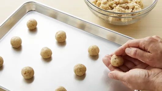 Step2Shape dough into 38 (1 1/4-inch) balls; place 1 inch apart on ungreased large cookie sheets.