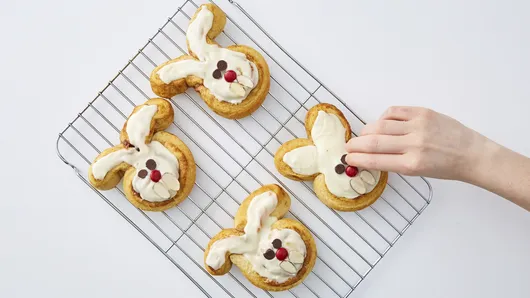 Place 4 rolls on cookie sheet, about 3 inches apart. Unwind remaining 4 rolls into long dough strips. For each bunny, place one dough strip, cut ends together, next to a whole roll. Press and firmly pinch cut ends into top of whole roll. Shape strip into floppy bunny ears.