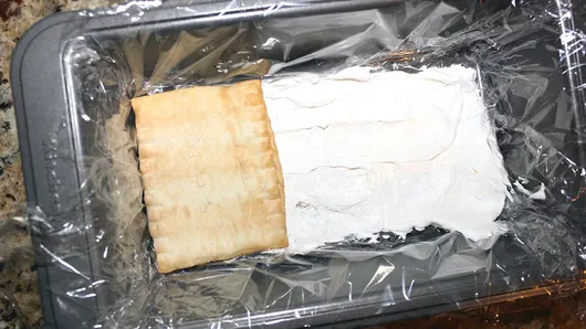 Step1Line bottom and sides of 9x5-inch loaf pan with plastic wrap.