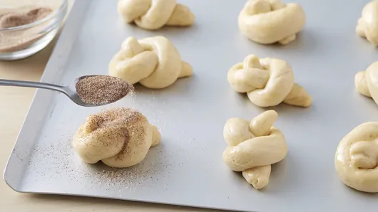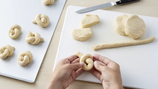 Step1Heat oven to 350°F. Separate dough into 8 biscuits. Cut each biscuit in half to form 2 strips. Roll each strip between hands into a 9-inch rope; wrap around, and tie in a knot. Place 1 inch apart on ungreased large cookie sheet.
