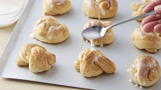 Step4Meanwhile, in small bowl, stir powdered sugar and 2 teaspoons of the milk until thin enough to drizzle. If necessary, add additional milk, 1/2 teaspoon at a time. Use spoon or fork to drizzle glaze over warm knots. Serve warm.