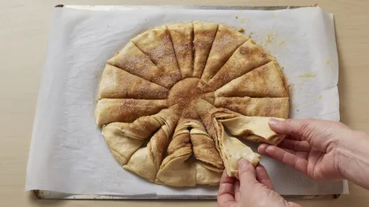 var configuration = {"title":"Cinnamon-Walnut Crescent Star Bread","introduction":"Layers of cream cheese, cinnamon, sugar and walnuts are twisted into a beautiful crescent star, the perfect centerpiece for your holiday brunch. Dunk each twist into a sweet cream cheese dip for a truly irresistible treat. ","servingSize":"1 Serving","image":{"small":{"media":"(min-width: 0px)","src":"https://mojo.generalmills.com/api/public/content/GVOu5SDvukS7-b02nD1ekA_webp_base.webp?v=6abc64dc\u0026t=e724eca7b3c24a8aaa6e089ed9e611fd"},"medium":{"media":"(min-width: 500px)","src":"https://mojo.generalmills.com/api/public/content/GVOu5SDvukS7-b02nD1ekA_webp_base.webp?v=6abc64dc\u0026t=191ddcab8d1c415fa10fa00a14351227"},"large":{"media":"(min-width: 767px)","src":"https://mojo.generalmills.com/api/public/content/GVOu5SDvukS7-b02nD1ekA_webp_base.webp?v=6abc64dc\u0026t=191ddcab8d1c415fa10fa00a14351227"},"alt":"Cinnamon-Walnut Crescent Star Bread"},"contributor":{"label":"By","name":"Pillsbury Kitchens","profileUrl":"/about-us","displayDate":{"label":"Updated","date":"Jan 31, 2019"}},"ingredientGroups":[{"name":"Crescent Star Bread","ingredients":[{"quantity":"1/3","description":"cup plus 2 tablespoons granulated sugar "},{"quantity":"1","description":"teaspoon ground cinnamon "},{"quantity":"4","description":"oz (half of 8-oz package) cream cheese, softened"},{"quantity":"1/2","description":"teaspoon vanilla "},{"quantity":"4","description":"cans (8 oz) refrigerated Pillsbury™ Original Crescent Dough Sheet","productLink":"/products/crescents/recipe-creations"},{"quantity":"1/4","description":"cup butter, melted "},{"quantity":"1/4","description":"cup finely chopped walnuts"}]},{"name":"Cream Cheese Dipping Sauce","ingredients":[{"quantity":"1/4","description":"cup butter, softened "},{"quantity":"4","description":"oz (half of 8-oz package) cream cheese, softened "},{"quantity":"1 1/2","description":"cups powdered sugar "},{"quantity":"3","description":"to 4 tablespoons milk"}]}],"steps":[{"description":"Heat oven to 350°F. Line large cookie sheet with cooking parchment paper; sprinkle lightly with flour. In small bowl, mix 1/3 cup granulated sugar and the cinnamon until blended. In another small bowl, mix 4 oz cream cheese, 2 tablespoons granulated sugar and the vanilla with spoon until well blended.","stepShotImageUrl":"//mojo.generalmills.com/api/public/content/yWzHKW4OwEmk0wK9lEp2rQ_webp_base.webp?v=000c8db5\u0026t=51a43a57af4046789e5a7f20567b1195"},{"description":"On cookie sheet, unroll first can of crescent dough. Press or roll dough into 12x11-inch rectangle. Place 10-inch round dinner plate or cardboard circle on top of dough rectangle. Using pizza cutter or sharp knife, cut away excess dough, and reserve for another use.","stepShotImageUrl":"//mojo.generalmills.com/api/public/content/k-L4wpaCt0amjGRpPYRZNw_webp_base.webp?v=6d881d74\u0026t=51a43a57af4046789e5a7f20567b1195"},{"description":"Brush surface of dough circle with 1 tablespoon of the melted butter. Sprinkle 2 tablespoons of the sugar-cinnamon mixture on top of dough circle. Sprinkle 2 tablespoons of the nuts on top; press in lightly. Place another piece of cooking parchment paper on work surface; lightly sprinkle with flour, then unroll second can of crescent dough on parchment. Repeat steps to cut out another 10-inch circle, and quickly transfer on top of sugar layer.","stepShotImageUrl":"//mojo.generalmills.com/api/public/content/7-X1QYzMj0KBZTMRhOwXcA_webp_base.webp?v=3c9c78a2\u0026t=51a43a57af4046789e5a7f20567b1195"},{"description":"Gently spread cream cheese mixture on top of dough circle. Lightly flour parchment paper, and unroll third can of crescent dough. Repeat steps to cut out another 10-inch circle, and quickly transfer on top.","stepShotImageUrl":"//mojo.generalmills.com/api/public/content/Bik2LtHfAkqjl4WpiO_woA_webp_base.webp?v=7a2de00c\u0026t=51a43a57af4046789e5a7f20567b1195"},{"description":"Brush with 1 tablespoon of the melted butter, and sprinkle 2 tablespoons sugar-cinnamon mixture on top of third dough circle. Sprinkle remaining nuts over top. Lightly flour parchment paper, and unroll fourth can of crescent dough. Repeat steps to cut out another 10-inch circle, and quickly transfer on top of sugar-cinnamon mixture. Brush top with remaining butter, and sprinkle with remaining sugar-cinnamon mixture.","stepShotImageUrl":"//mojo.generalmills.com/api/public/content/MHCqptoA8UC4VYr29io41g_webp_base.webp?v=987eaa79\u0026t=51a43a57af4046789e5a7f20567b1195"},{"description":"Place a glass or small jar with 2 1/2 to 3-inch opening in center of dough circle stack. Leaving center intact, use sharp knife to cut layered dough into quarters (12 o’clock, 3 o’clock, 6 o’clock and 9 o’clock). Divide each quarter into 4 equal parts, creating 16 total sections. Remove glass from center of dough.","stepShotImageUrl":"//mojo.generalmills.com/api/public/content/Dml-UCCCdkKHYnxmYsDaGA_webp_base.webp?v=aa0a953f\u0026t=51a43a57af4046789e5a7f20567b1195"},{"description":"To twist, take two sections of dough (side-by-side), and slightly pull and twist each section in the opposite direction of each other. Repeat for all 16 sections of dough.","stepShotImageUrl":"//mojo.generalmills.com/api/public/content/3bhGxRU2KkSob07DZnyh5g_webp_base.webp?v=06091850\u0026t=51a43a57af4046789e5a7f20567b1195"},{"description":"Bake 27 to 30 minutes or until deep golden brown and baked through. Cool 5 minutes on cookie sheet. Use spatula to carefully help slide from parchment to serving platter, loosening edges with spatula first, if needed. In small bowl, mix Cream Cheese Dipping Sauce ingredients until well blended. If too thick to dip, add additional drops of milk. Serve with bread."}],"tips":[{"title":"","description":"We found the easiest way to transfer each dough circle is to cut each circle on a sheet of parchment paper and then use that parchment paper to carefully flip it over onto the stack.","category":"Techniques","tipShots":[]},{"title":"","d