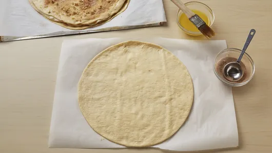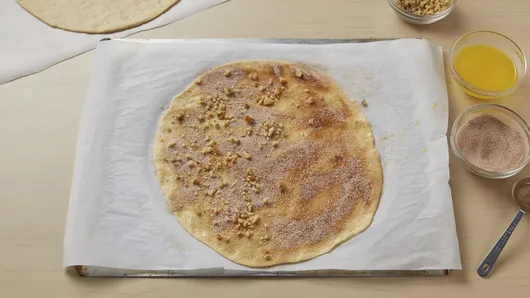 Brush surface of dough circle with 1 tablespoon of the melted butter. Sprinkle 2 tablespoons of the sugar-cinnamon mixture on top of dough circle. Sprinkle 2 tablespoons of the nuts on top; press in lightly. Place another piece of cooking parchment paper on work surface; lightly sprinkle with flour, then unroll second can of crescent dough on parchment. Repeat steps to cut out another 10-inch circle, and quickly transfer on top of sugar layer.
