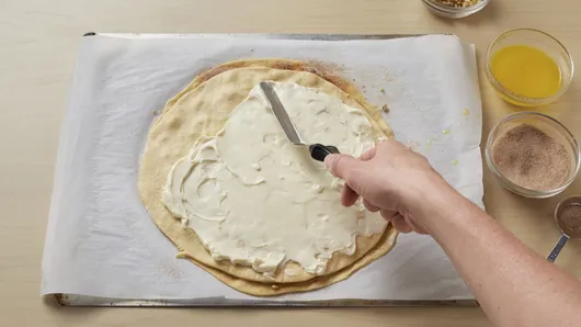 Gently spread cream cheese mixture on top of dough circle. Lightly flour parchment paper, and unroll third can of crescent dough. Repeat steps to cut out another 10-inch circle, and quickly transfer on top.