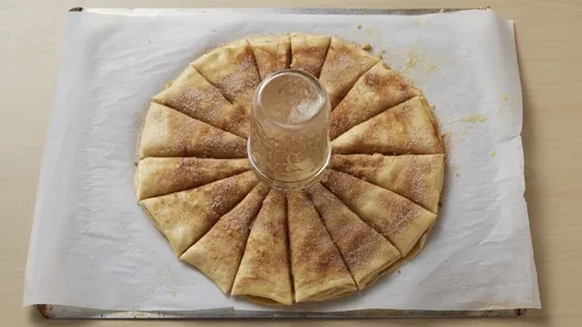 Place a glass or small jar with 2 1/2 to 3-inch opening in center of dough circle stack. Leaving center intact, use sharp knife to cut layered dough into quarters (12 o’clock, 3 o’clock, 6 o’clock and 9 o’clock). Divide each quarter into 4 equal parts, creating 16 total sections. Remove glass from center of dough.