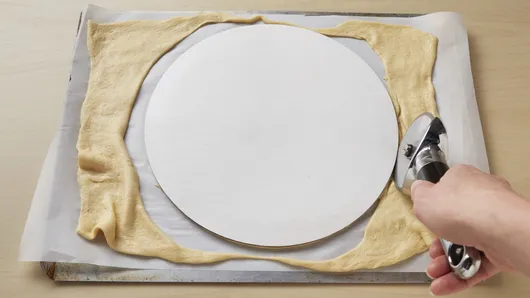 On cookie sheet, unroll first can of crescent dough. Press or roll dough into 12x11-inch rectangle. Place 10-inch round dinner plate or cardboard circle on top of dough rectangle. Using pizza cutter or sharp knife, cut away excess dough, and reserve for another use.