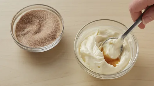 Heat oven to 350°F. Line large cookie sheet with cooking parchment paper; sprinkle lightly with flour. In small bowl, mix 1/3 cup granulated sugar and the cinnamon until blended. In another small bowl, mix 4 oz cream cheese, 2 tablespoons granulated sugar and the vanilla with spoon until well blended.