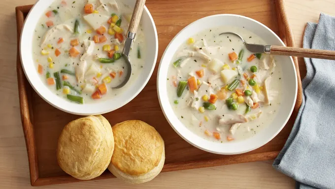 var configuration = {"title":"Classic Chicken Pot Pie","introduction":"\u003cp\u003eIf you asked us what the perfect comfort meal is, we’d have to say homemade chicken pot pie! This top-rated and viewed recipe on Pillsbury.com was originally developed in the Pillsbury Test Kitchens in 1999 for a pie booklet. It was also featured on our refrigerated Pillsbury pie crust box. This chicken pot pie recipe features leftover cooked chicken and frozen mixed veggies in a thick, buttery-rich sauce, all tucked inside flaky pie pastry. It’s a warm, satisfying dinner perfect for any meal of the week.\u003c/p\u003e\u003cp\u003eOver the years, we’ve perfected this recipe in a few ways. We’ve added a 1/4 cup more chicken broth and 3 tablespoons less milk for the best-tasting sauce. We also found that baking the pie in a glass pie plate ensures the flakiest crust. Our pro tip: cover the edge of the pie during the last portion of baking for a picture-perfect finish. You’ll find our updates over the years to this tried-and-true dish make it even simpler and scrumptious. This year-round classic is ideal for using up leftover chicken and will be ready to enjoy in about an hour!\u003c/p\u003e","servingSize":"1 Serving","image":{"small":{"media":"(min-width: 0px)","src":"https://mojo.generalmills.com/api/public/content/HgqAHgEWTbuBbac6hyDsVw_webp_base.webp?v=ff3d8fd0\u0026t=e724eca7b3c24a8aaa6e089ed9e611fd"},"medium":{"media":"(min-width: 500px)","src":"https://mojo.generalmills.com/api/public/content/HgqAHgEWTbuBbac6hyDsVw_webp_base.webp?v=ff3d8fd0\u0026t=191ddcab8d1c415fa10fa00a14351227"},"large":{"media":"(min-width: 767px)","src":"https://mojo.generalmills.com/api/public/content/HgqAHgEWTbuBbac6hyDsVw_webp_base.webp?v=ff3d8fd0\u0026t=191ddcab8d1c415fa10fa00a14351227"},"alt":"Classic Chicken Pot Pie"},"contributor":{"label":"By","name":"Edited by Mandy","profileUrl":"/about-us/mandy","displayDate":{"label":"Updated","date":"Jun 12, 2025"}},"ingredientGroups":[{"name":"Crust","ingredients":[{"quantity":"1","description":"box (14.1 oz) refrigerated Pillsbury™ Pie Crusts (2 Count), softened as directed on box","productLink":"/products/pie-crust/refrigerated-pie-crust"}]},{"name":"Filling","ingredients":[{"quantity":"1/3","description":"cup butter or margarine"},{"quantity":"1/3","description":"cup chopped onion"},{"quantity":"1/3","description":"cup all-purpose flour"},{"quantity":"1/2","description":"teaspoon salt"},{"quantity":"1/4","description":"teaspoon pepper"},{"quantity":"1 3/4","description":"cups from 1 carton Progresso™ Classic Chicken Broth"},{"quantity":"1/2","description":"cup milk"},{"quantity":"2 1/2","description":"cups shredded cooked chicken or turkey"},{"quantity":"2","description":"cups frozen mixed vegetables, thawed"}]}],"steps":[{"description":"\u003cp\u003eBring crusts to room temperature by removing outer package and placing on your counter for 15 minutes. Heat oven to 425°F.\u003c/p\u003e","stepShotImageUrl":"//mojo.generalmills.com/api/public/content/-lxqfDU_QRys7nB4GndxSQ_webp_base.webp?v=0cbf21eb\u0026t=51a43a57af4046789e5a7f20567b1195"},{"description":"\u003cp\u003ePlace 1 pie crust in ungreased 9-inch glass pie plate. Press crust firmly against side and bottom, allowing any extra crust to hang over the edge.\u003c/p\u003e","stepShotImageUrl":"//mojo.generalmills.com/api/public/content/s3xaPUGuSAKY9DExaPmw_Q_webp_base.webp?v=139b2af9\u0026t=51a43a57af4046789e5a7f20567b1195"},{"description":"\u003cp\u003eIn 2-quart saucepan, melt butter over medium heat. Add onion; cook 2 minutes, stirring frequently, until tender.\u0026nbsp;\u003c/p\u003e","stepShotImageUrl":"//mojo.generalmills.com/api/public/content/8sI8jmG5QWGvVso_yi4uJg_webp_base.webp?v=b2ce78e4\u0026t=51a43a57af4046789e5a7f20567b1195"},{"description":"\u003cp\u003eStir in flour, salt, and pepper until well blended.\u003c/p\u003e","stepShotImageUrl":"//mojo.generalmills.com/api/public/content/81hdCBzCReia87egjoM8Sg_webp_base.webp?v=c95a6409\u0026t=51a43a57af4046789e5a7f20567b1195"},{"description":"\u003cp\u003eGradually stir in broth and milk, cooking and stirring until bubbly and thickened.\u003c/p\u003e","stepShotImageUrl":"//mojo.generalmills.com/api/public/content/BfGh5QCwQp2Vj_qFlBdwbg_webp_base.webp?v=6c2cb8f5\u0026t=51a43a57af4046789e5a7f20567b1195"},{"description":"\u003cp\u003eStir in chicken and mixed vegetables until thoroughly combined. Remove from heat.\u003c/p\u003e","stepShotImageUrl":"//mojo.generalmills.com/api/public/content/CFxFlNqQTBuaKryDSjrDVg_webp_base.webp?v=02957035\u0026t=51a43a57af4046789e5a7f20567b1195"},{"description":"\u003cp\u003eSpoon chicken mixture into crust-lined pie plate.\u003c/p\u003e","stepShotImageUrl":"//mojo.generalmills.com/api/public/content/--MmD_S4TDGbAhVOFNeioQ_webp_base.webp?v=7142ca5a\u0026t=51a43a57af4046789e5a7f20567b1195"},{"description":"\u003cp\u003ePlace second crust over the chicken mixture. Fold excess top crust under the edge of the bottom crust, pressing edges together to seal and create a thick rim.\u003c/p\u003e","stepShotImageUrl":"//mojo.generalmills.com/api/public/content/R1U2nCQDTLCxDbM33KO_Rw_webp_base.webp?v=d088bd93\u0026t=51a43a57af4046789e5a7f20567b1195"},{"description":"\u003cp\u003eFlute the edge of the pie crust by placing your thumb and index finger about 1 inch apart on the outside edge. With your other thumb, push the pastry toward the outside to form a scalloped edge.\u003c/p\u003e","stepShotImageUrl":"//mojo.generalmills.com/api/public/content/A2FIUT7wTRue7S7EG8PFpg_webp_base.webp?v=580cdfd3\u0026t=51a43a57af4046789e5a7f20567b1195"},{"description":"\u003cp\u003eWith a small knife, cut slits or shapes in several places in top crust to allow steam to escape while baking.\u003c/p\u003e","stepShotImageUrl":"//mojo.generalmills.com/api/public/content/Qf51MIDlQ5yulurQdgf7HQ_webp_base.webp?v=673d149a\u0026t=51a43a57af4046789e5a7f20567b1195"},{"description":"\u003cp\u003eBake 15 minutes. Then cover edge of crust with foil to prevent excessiv