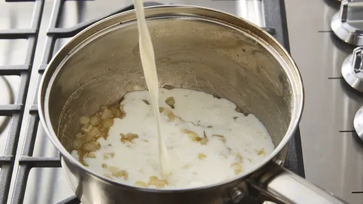 Step3Stir in flour with whisk until mixture is smooth and bubbly, stirring constantly. Gradually stir in milk until mixture boils and thickens, stirring frequently. Stir in salt and pepper.