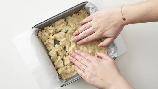 Step2In medium bowl, break up 1 roll (16.5 oz) Pillsbury™ refrigerated sugar cookies; knead in 2 tablespoons pastel-colored candy sprinkles until well blended. Press mixture in pan.