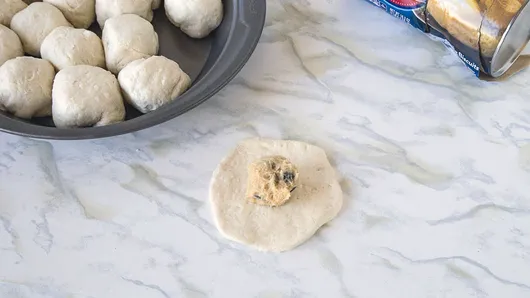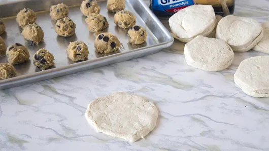 Step3Grease or spray 9-inch pie plate with cooking spray. Place 1 cookie dough ball in center of each biscuit circle. Fold biscuit around ball, and press to seal around ball. Place seam side down in pie plate.