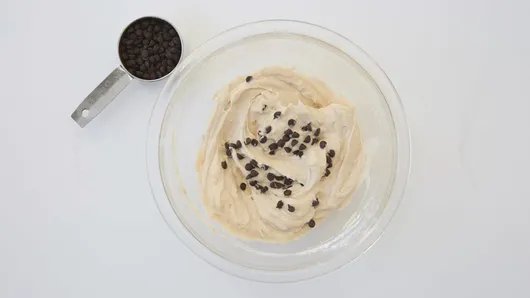 Step2Beat in yogurt, powdered sugar, vanilla and salt on low speed until blended. Stir in chocolate chips.