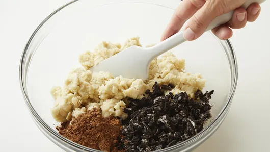 In large bowl, break up cookie dough; stir or knead in cocoa and chopped cookies until well mixed. Shape dough into 30 (1-inch) balls. Place 1 inch apart on ungreased cookie sheets.