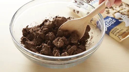 Step2In medium bowl, crumble cookie dough; stir or knead in cocoa until well mixed. Stir or knead in crushed cookies and white vanilla baking chips. Press mixture evenly in bottom of baking dish. Bake 18 to 20 minutes or until set. Cool 20 minutes.