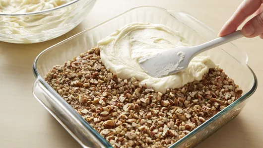 Step4In medium microwavable bowl, microwave 6 tablespoons of the butter uncovered on High 30 to 60 seconds or until melted. Beat in powdered sugar and remaining 6 tablespoons whipping cream until smooth and creamy. Pour and spread evenly over pecans. Refrigerate about 1 hour or until set.