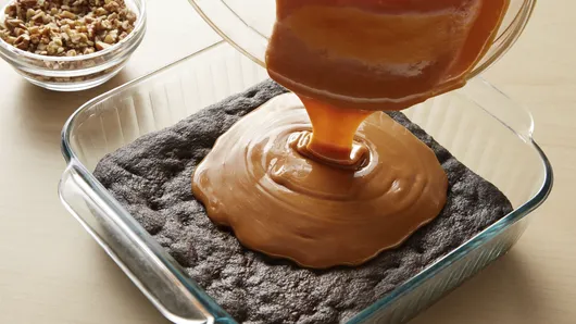 Step3In medium microwavable bowl, microwave caramel bits and 2 tablespoons of the whipping cream uncovered on High 1 1/2 to 2 1/2 minutes, stirring every 30 seconds, until smooth. Carefully pour and spread caramel mixture evenly over cooled bar base. Sprinkle with pecans. Cool about 20 minutes or until caramel is set.