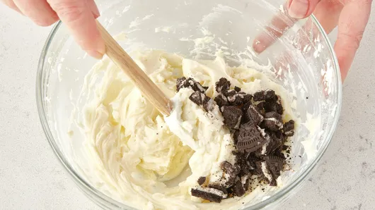 Step2In medium bowl, beat cream cheese with electric mixer on medium speed until smooth. Add powdered sugar; beat until smooth. Beat in vanilla. Stir in 1/4 cup of the crushed cookies.