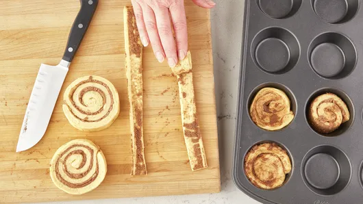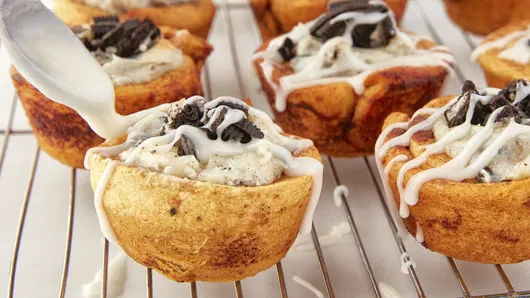 Step4Bake 18 to 20 minutes or until rolls are baked through and golden brown. Cool 2 minutes in pan, then transfer to cooling rack. Top rolls evenly with remaining 1/4 cup crushed cookies, pressing down slightly into filling.