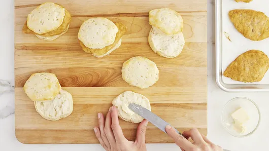 Step4Split warm biscuits in half; spread split sides and biscuit tops with reserved 2 tablespoons softened butter. Place baked chicken cutlets on bottom halves of biscuits; top with remaining biscuit halves. Serve warm.