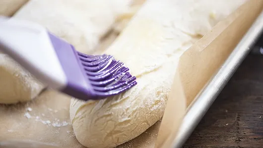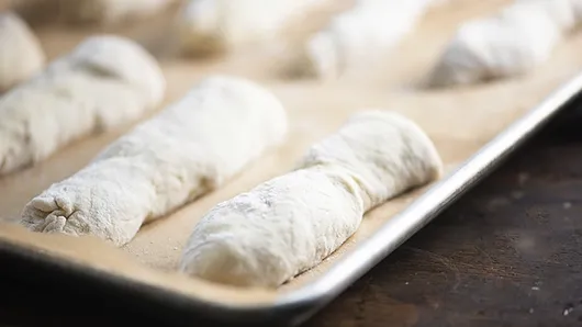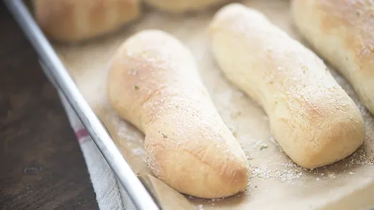 Step4Break dough into fourths. Roll each fourth into a long, thin log about 16 inches long. Cut each log into three pieces. Place the breadsticks on a parchment-lined baking sheet and cover with a clean cloth.