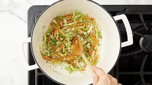 In 5-quart Dutch oven, heat oil over medium-high heat. Add cabbage, carrots, onion, celery, garlic, Italian seasoning, 1/4 teaspoon salt and 1/4 teaspoon pepper; cook 6 to 8 minutes, stirring frequently, until vegetables are softened.