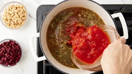 Stir in 6 cups water, the vegetable base, tomatoes, kidney and cannellini beans. Heat to boiling, stirring occasionally. Reduce heat to medium-low; cover and cook 15 minutes.