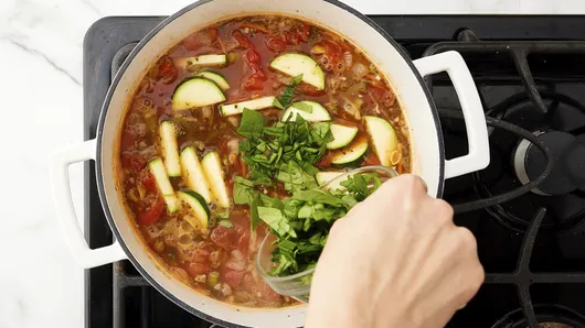 Stir in pasta, green beans, zucchini and spinach. Heat to boiling; reduce heat to medium-low. Cover and simmer about 10 minutes, stirring occasionally, until pasta is tender.
