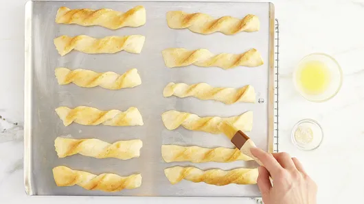 Meanwhile, bake breadsticks as directed on can. Remove from oven; immediately brush tops with melted butter. In small bowl, mix garlic powder and 1/4 teaspoon coarse salt. Sprinkle mixture lightly onto buttered breadsticks; serve warm with soup.