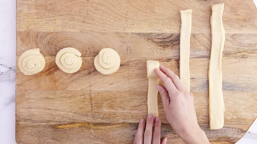 Step2With pizza cutter or sharp knife, cut each dough strip lengthwise into 4 equal strips, to make 24 strips.