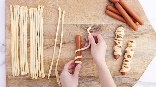 Step3Wrap 3 strips of dough around each hot dog to look like “bandages,” stretching dough slightly to cover hot dog. About 1/2 inch from one end of each hot dog, separate “bandages” so hot dog shows through for “face.” Place wrapped hot dogs onto cookie sheet.