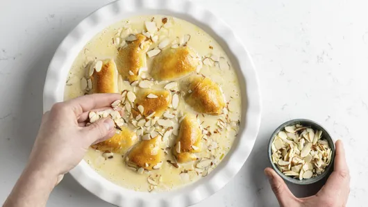 Remove baking dish from oven. In small bowl, combine all sauce ingredients; beat with wire whisk until well blended. Spoon sauce evenly over partially baked rolls. Sprinkle with almonds and cinnamon.