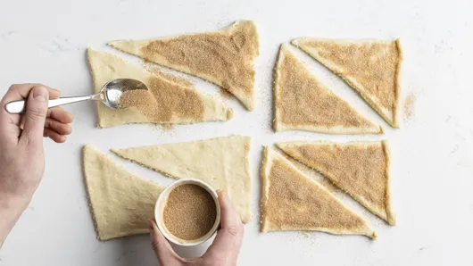 Heat oven to 375°F. In small bowl, combine 2 tablespoons sugar and 1/2 to 1 teaspoon cinnamon; mix well. Separate dough into 8 triangles; sprinkle sugar mixture evenly over each. Gently press sugar mixture into each triangle, flattening each slightly.