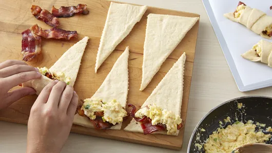 Unroll dough; separate into 8 triangles. Cut each slice of bacon in half crosswise. Place 2 pieces bacon on shortest side of each triangle; top with about 2 tablespoons scrambled egg mixture. Roll up at shortest side of triangle, rolling to opposite point. Place crescents, point side down, on cookie sheet.