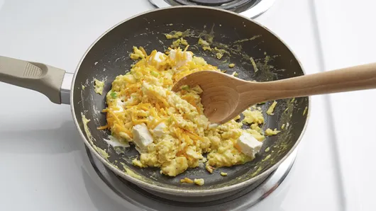 In medium bowl, beat eggs, 1 tablespoon of the green onions and the pepper with whisk or fork until well mixed. Pour egg mixture in same skillet; cook over medium heat 1 to 2 minutes or until eggs are thoroughly cooked but still moist. Add cream cheese and 1/2 cup of the Cheddar cheese. Cook 1 to 2 minutes, stirring occasionally, until cheese is melted.