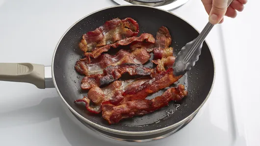 In 12-inch nonstick skillet, cook bacon over medium-high heat about 4 minutes or until cooked but not crisp, turning once. Set bacon aside; drain all except 1 tablespoon bacon drippings from skillet.