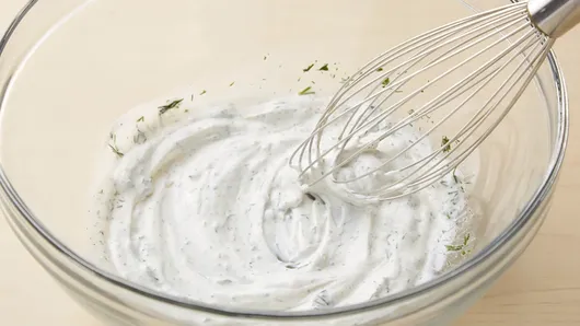 Step1In large bowl, mix sour cream, white wine vinegar, dill weed, salt and pepper with whisk.