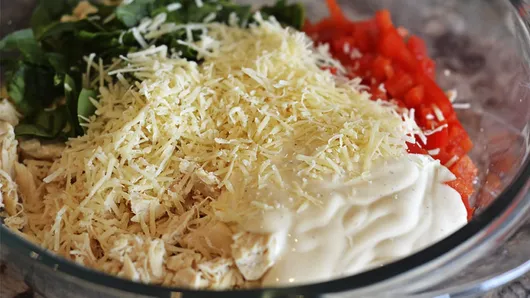 Step3In medium bowl, place shredded chicken, bell pepper, spinach, garlic, 1/4 cup of the Parmesan cheese and 1 cup of the Alfredo sauce; stir until combined.