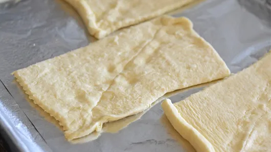 Step2Separate dough from both cans into 8 rectangles; press perforations to seal.