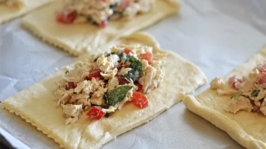 Step4Place 1/2 cup chicken mixture onto center of each rectangle. For each bundle, bring up 4 corners of dough and fold over top of filling; gently press dough together to form a ball and hide the filling. Repeat with remaining rectangles and chicken mixture. Place 4 on each cookie sheet.