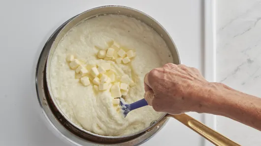Stir in butter at the end of cooking. This will give your grits a rich, creamy, decadent final coating. For other finishing options, check out our serving suggestions below.