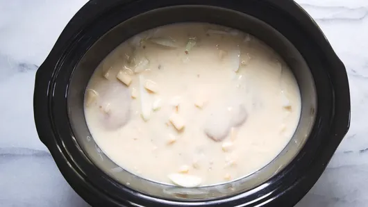 Step3Pour 2 cans (18.5 oz each) Progresso™ Light creamy potato with bacon & cheese soup and 1/2 cup Progresso™ chicken broth into slow cooker. Cover; cook on High heat setting 3 hour 15 minutes or on Low heat setting 6 hour 15 minutes.