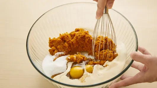 Step3Meanwhile, in large bowl, beat eggs, pumpkin, 1/2 cup of the whipping cream, 1/2 cup of the chai concentrate, the sugar and salt with whisk until well blended. Pour pumpkin mixture evenly over crust.