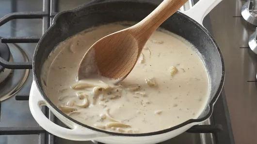 Step4Cool 5 minutes before serving to allow sauce to thicken. Serve with egg noodles. Garnish with chopped chives.