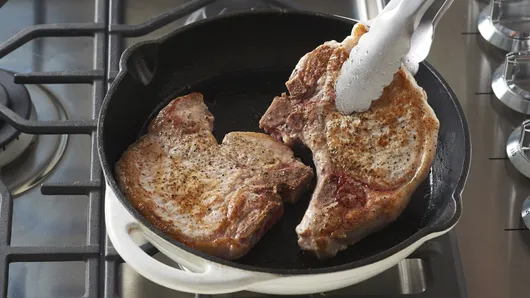 Step2Season pork chops with pepper. Add to same skillet; cook over medium-high heat 5 to 7 minutes, turning once, until browned (145°F). Remove from skillet to plate; cover and keep warm.